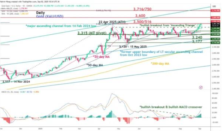 Terobosan di atas US$3.435 menandakan emas memulai fase akselerasi bullish jangka pendek hingga menengah, terutama didorong oleh antisipasi kebijakan dovish Federal Reserve AS pada September 2025.