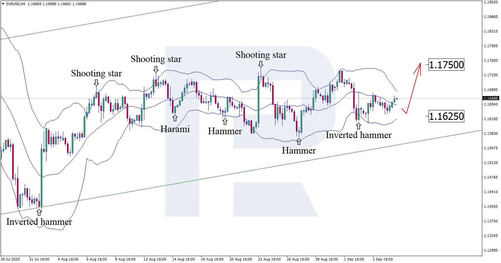 Pada grafik H4, EUR/USD membentuk pola Inverted Hammer di dekat Bollinger Band bawah, mengindikasikan potensi pembalikan naik. Pasangan ini masih berada dalam kanal naik, sehingga peluang untuk menguji resistance 1,1750 tetap terbuka.